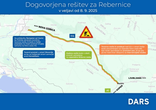 Spremenjena prometna ureditev, ki bo veljala od 8. septembra, predvideva, da bodo tovorna vozila in avtobusi nad 3,5 tone v smeri Italije preusmerjali na vipavsko hitro cesto, kjer bodo uporabljali en prometni pas. Drugi pas bo rezerviran izključno za intervencijske službe.
